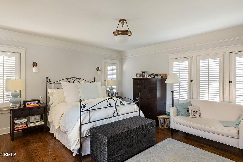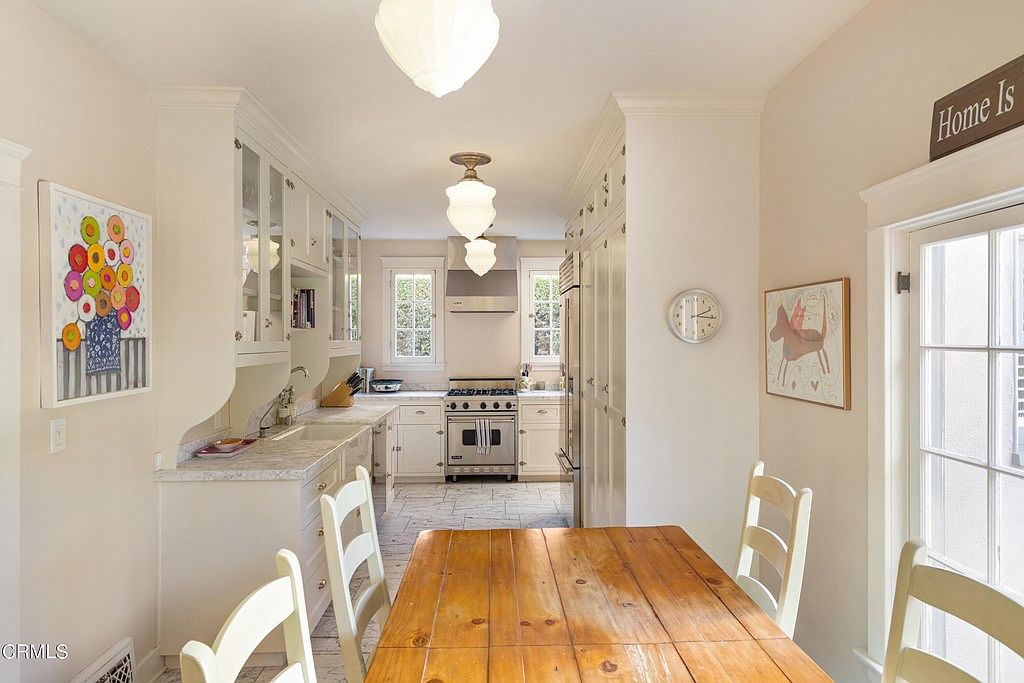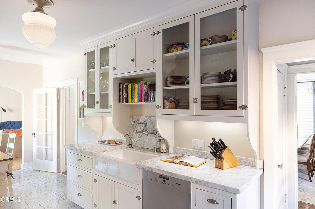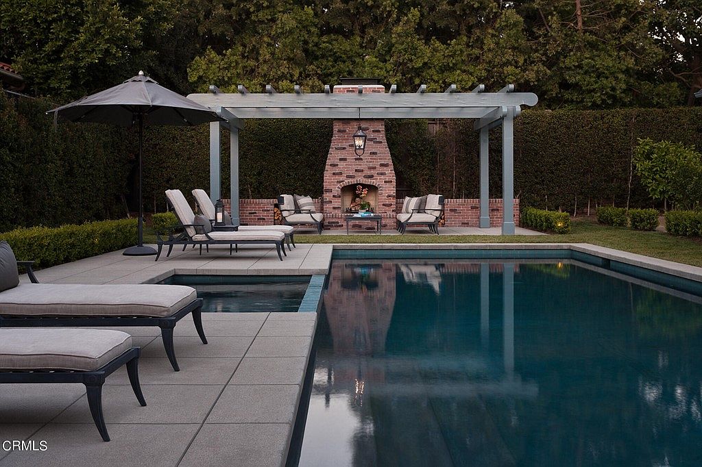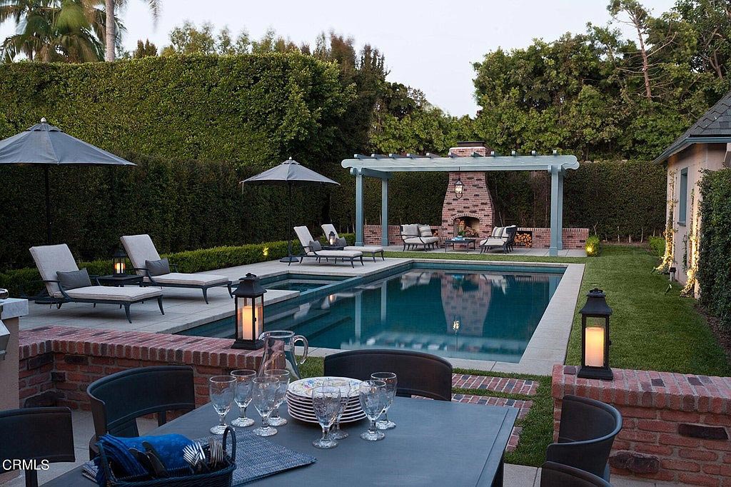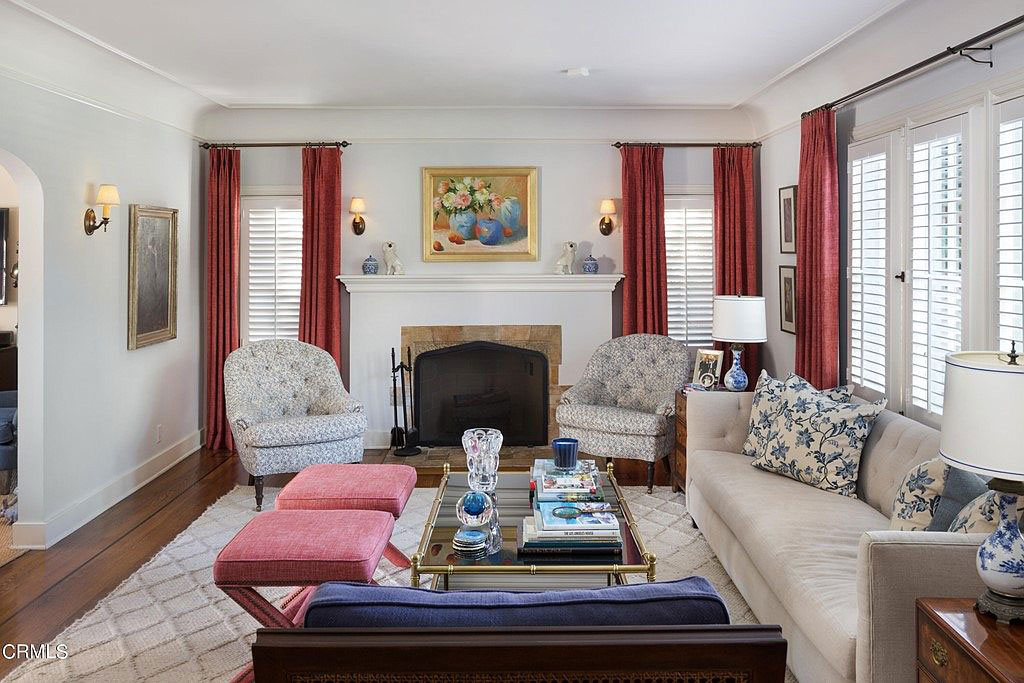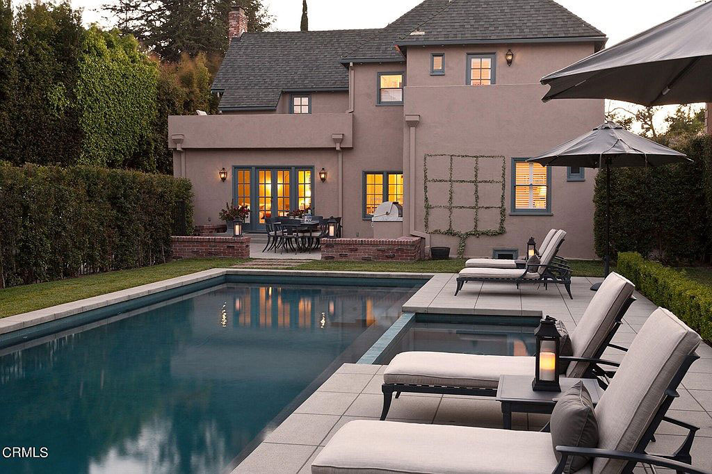 this stately, 1924 English manor house revival in Hancock Park is the perfect property for those looking for a location that meets both an urban and suburban setting. Restored in 2008, the 2,696 square foot house has all the tenets of a formal period revival built during the Southern California land boom of the 1920s. Access from the front of the home is gained through a large, four-centered, clinker brick archway, a theme that is also repeated in the outdoor fireplace and the Batchelder tile fireplace of the great room. Designed with a center hall floor plan, the formal dining room, and the great room on either side of the hallway with their oak floors with a classic, dark walnut inlaid border offers a glimpse of what is in store for visitors as they enter the rest of the house. French doors which provide direct access to the outdoor kitchen, backyard, outdoor fireplace, and saltwater pool and spa, all of which, of course, provide the perfect environment.